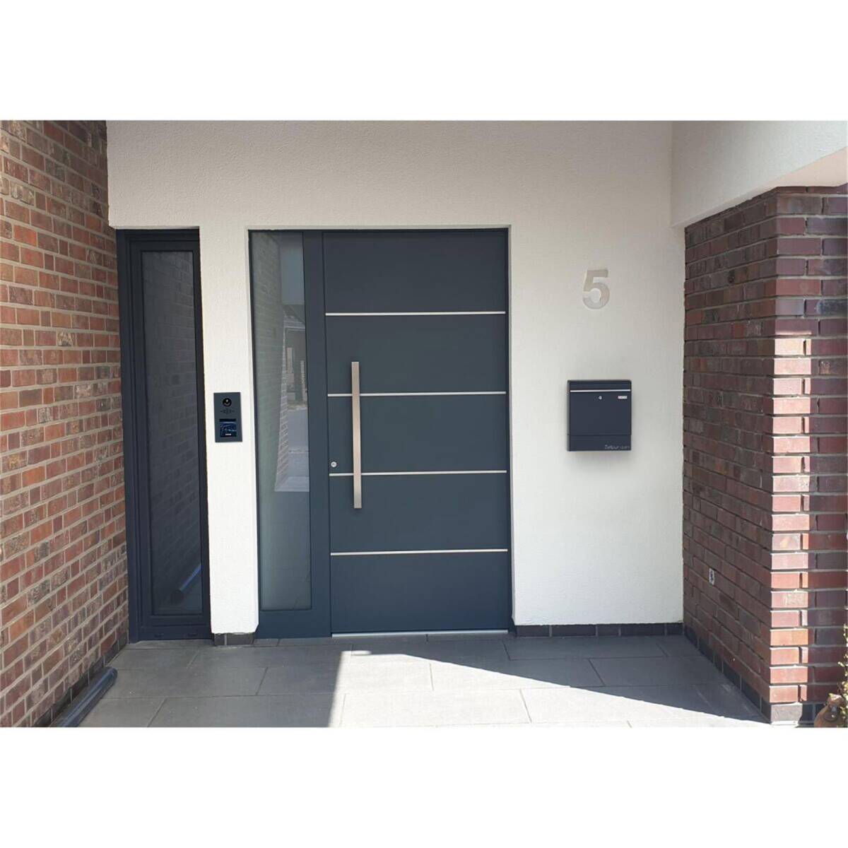 Der Metzler Briefkasten überzeugt mit seiner perfekten Kombination aus Funktionalität und modernem Design. Gefertigt aus hochwertigem, massivem Stahl und pulverbeschichtet in elegantem Anthrazitgrau (RAL 7016, Feinstruktur matt), ist er besonders witterungsbeständig und langlebig. Der robuste Rahmen aus V2A Edelstahl garantiert zusätzliche Stabilität und Widerstandsfähigkeit. Dank der großzügigen Einwurfklappe eignet sich der Briefkasten für Formate wie DIN C6, DIN Lang A4, DIN C4 / A4. Ein weiteres Highlight ist das austauschbare Namensschild, das eine individuelle Anpassung ermöglicht. Der Briefkasten bietet optimalen Schutz vor Witterungseinflüssen und fügt sich mit seinem gradlinigen Design nahtlos in jeden Eingangsbereich ein. Ein stilvoller und praktischer Briefkasten für höchste Ansprüche.
