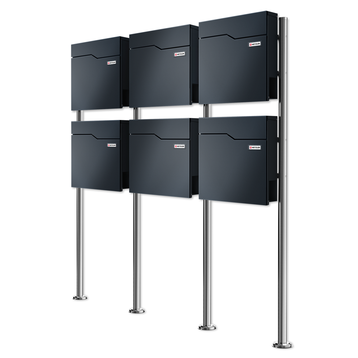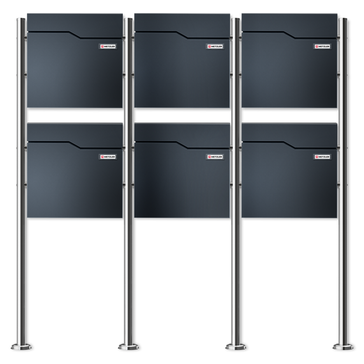 Der freistehende Metzler sechsfach Standbriefkasten "HOFFMANN" Mehrfamilienhaus mit austauschbarem Namensschild für Häuser mit 6 Mieteinheiten überzeugt durch eine robuste Konstruktion aus massivem Stahl, die dank einer Pulverbeschichtung in Anthrazitgrau, Graualuminium, Anthrazitgrau/Eisenglimmer oder Tiefschwarz optimal vor Wind und Wetter geschützt ist. Der Standfuß, aus rostfreiem Edelstahl gefertigt, bildet einen stabilen und stilvollen Kontrast zum Rest des Briefkastens und kann sicher im Boden verankert werden. Die großzügige Einwurfklappe ermöglicht es, DIN C6, DIN Lang A4, DIN C4 / A4 Umschläge problemlos einzuführen, ohne dass diese geknickt werden. Sie schützt gleichzeitig das verdeckte Briefkastenschloss vor Witterungseinflüssen und Vereisung, was die Funktionalität des Briefkastens das ganze Jahr über sicherstellt. Die Konstruktion ist sowohl stabil als auch langlebig und beständig gegen Korrosion, was den Standbriefkasten zu einer zuverlässigen Wahl für jedes Zuhause macht. Zudem lassen sich die Namensschilder einfach austauschen, sodass die Briefkastenanlage jederzeit an neue Gegebenheiten angepasst werden kann. Der Lieferumfang umfasst neben dem Standbriefkasten auch zwei Schlüssel pro Einheit sowie das benötigte Befestigungsmaterial zur sicheren Montage im Boden.